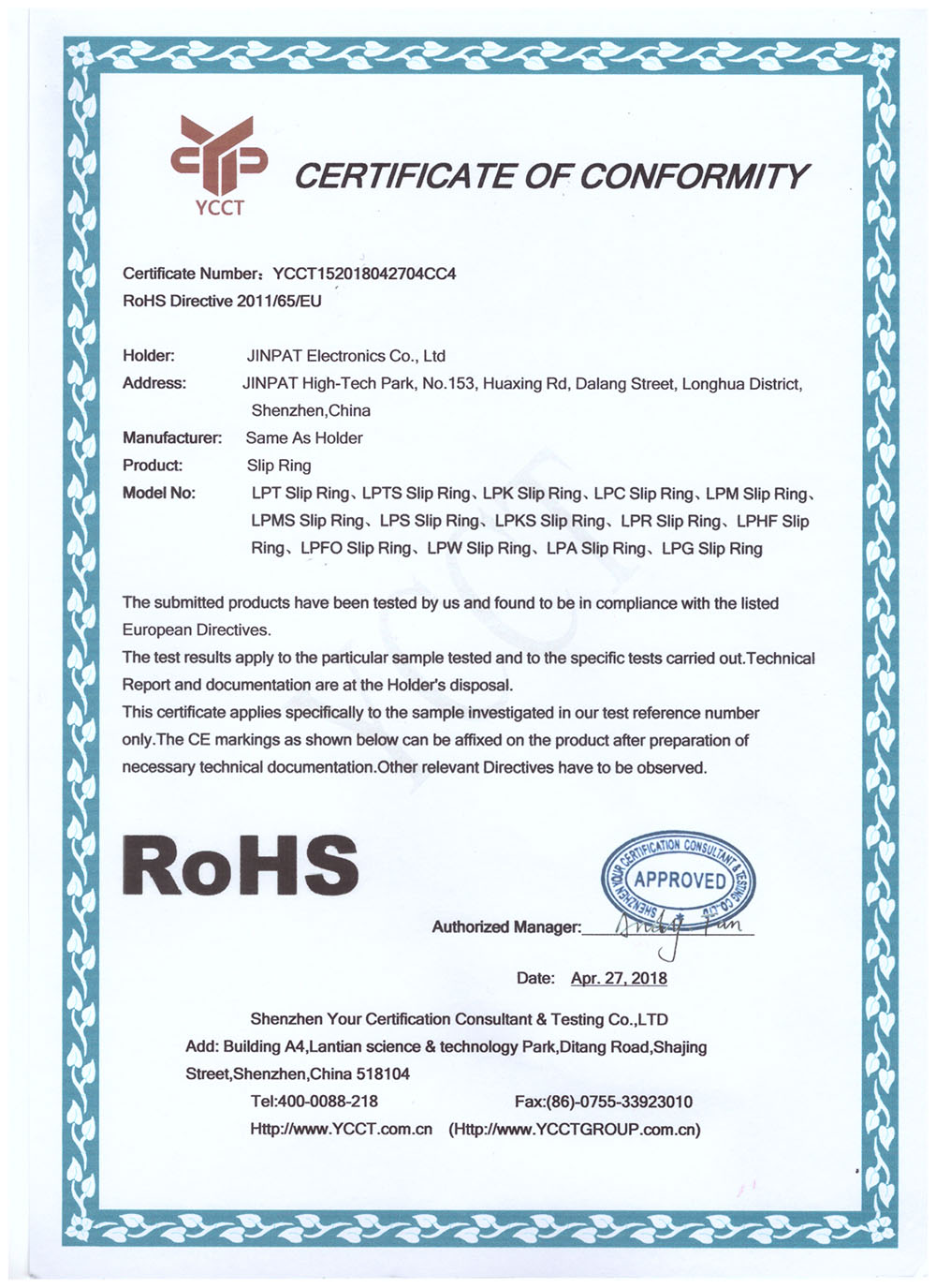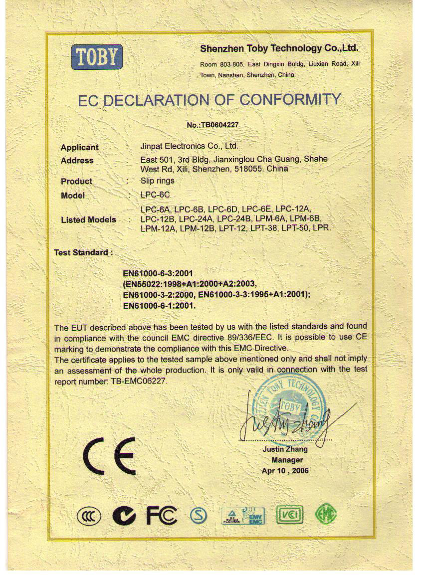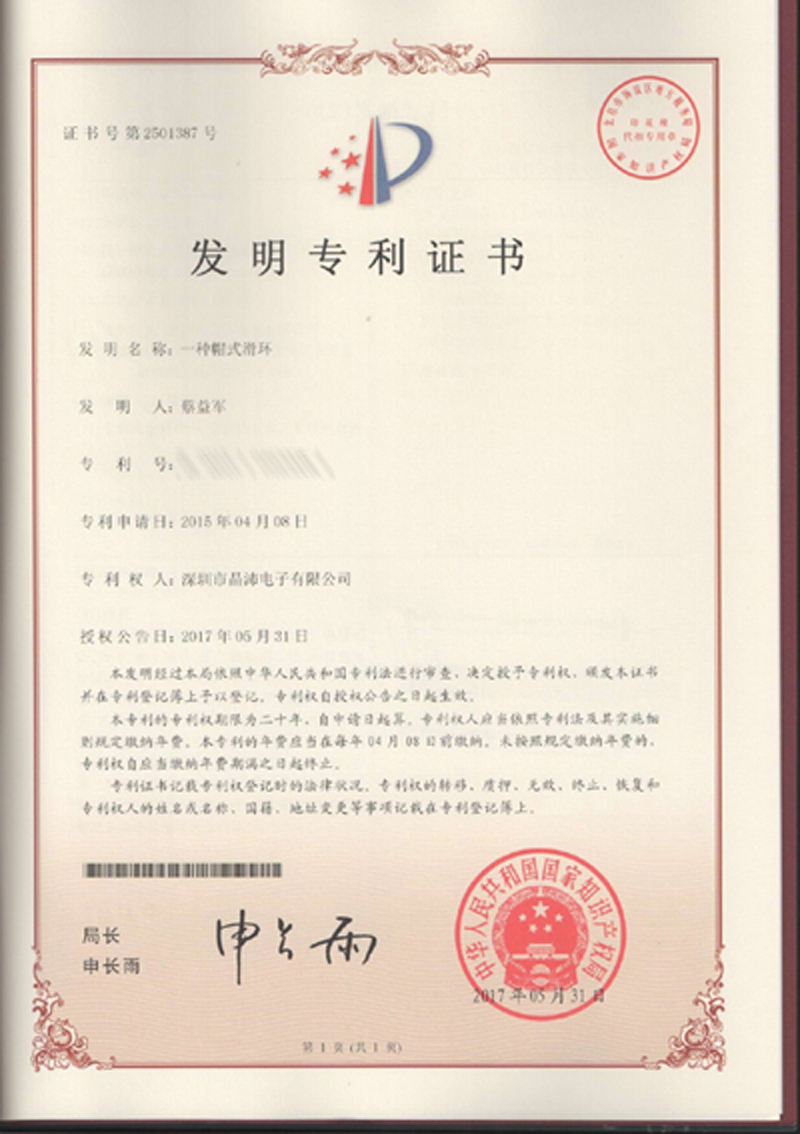 晶沛通過(guò)了歐盟CE認(rèn)證风和日丽、FCC認(rèn)證包罗万象、SGS認(rèn)證方有才可搏世、BV“船級(jí)社”認(rèn)證、防爆認(rèn)證等多項(xiàng)認(rèn)證,生產(chǎn)的導(dǎo)電滑環(huán)都符合RoHS環(huán)保要求,先后被授予“國(guó)家高新技術(shù)企業(yè)”稱(chēng)號(hào),目前已獲得45項(xiàng)專(zhuān)利,其中發(fā)明專(zhuān)利6項(xiàng)。